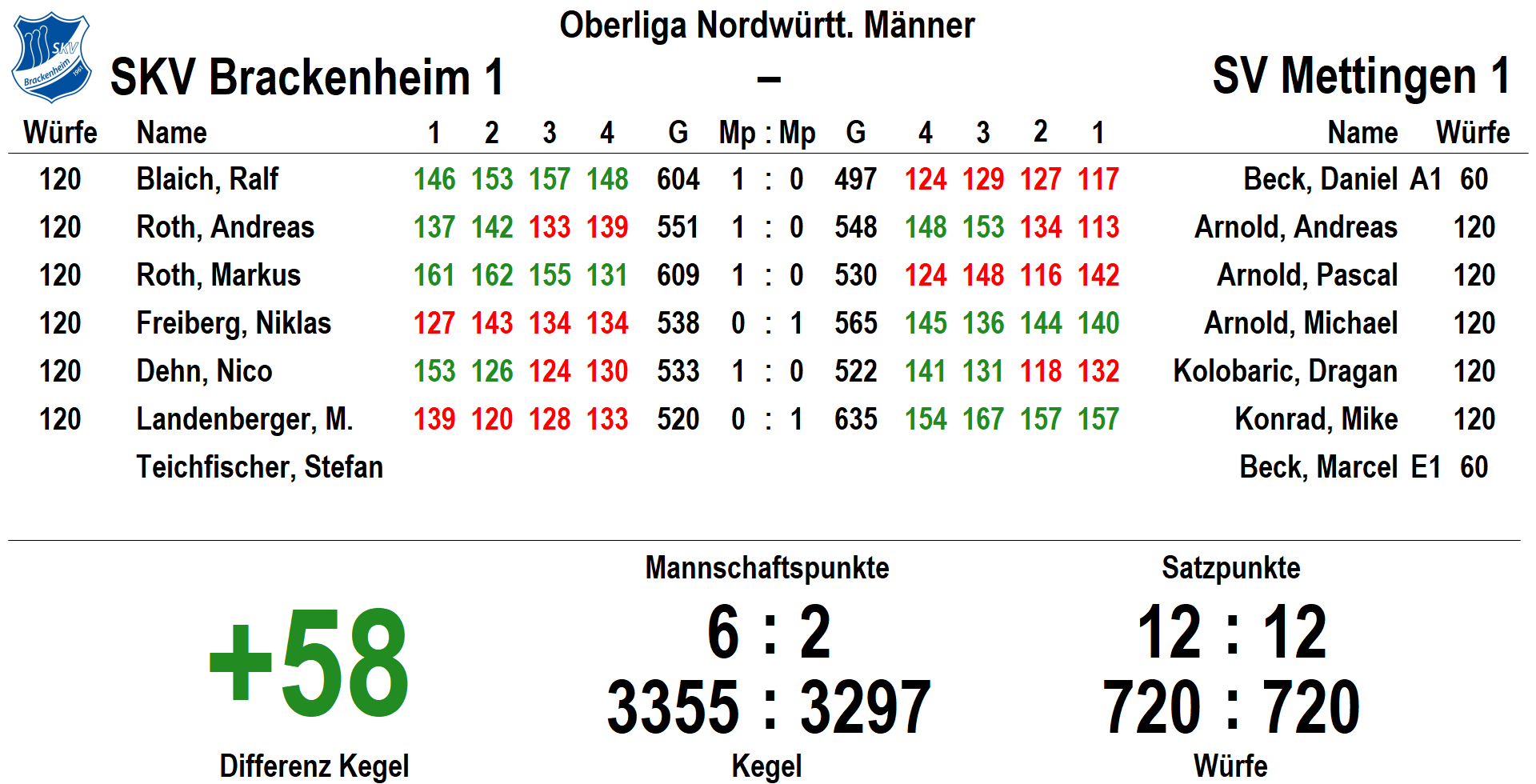 Mit Rückenwind starteten die Männer gegen den SV Mettingen. Zu Beginn starteten Ralf Blaich mit sehr guten 604 (4/1) und Andreas Roth ordentlichen 551 (2/1) ins Spiel. Beide konnten ihre Duelle gewinnen und 110 Kegel Vorsprung erspielen. In der Mittelachse konnte Markus Roth mit 609 (4/1), der heutigen SKV-Bestleistung, den nächsten Punkt einsammelt. Oberliga Neuling Niklas Freiberg schlug sich mit 538 (0/0) gut. Die Schlusspaarung bekam mit 3:1 und 162 Kegel Vorsprung ordentlich Rückenwind. Marcel Landenberger hatte mit seinem Spiel zu kämpfen. Er erreichte noch 520 (0/0), während sein Gegenspieler die Tagesbestleistung von 635 Kegel erspielte. Schlusspartner Nico Dehn erspielte mit 533 (2/1) den nächsten Mannschaftspunkt. Auch hier kamen die zwei Bonuspunkte durch die bessere Gesamtkegelzahl zur Heimmannschaft, was auch hier die nächsten Tabellenpluspunkte bedeutete.