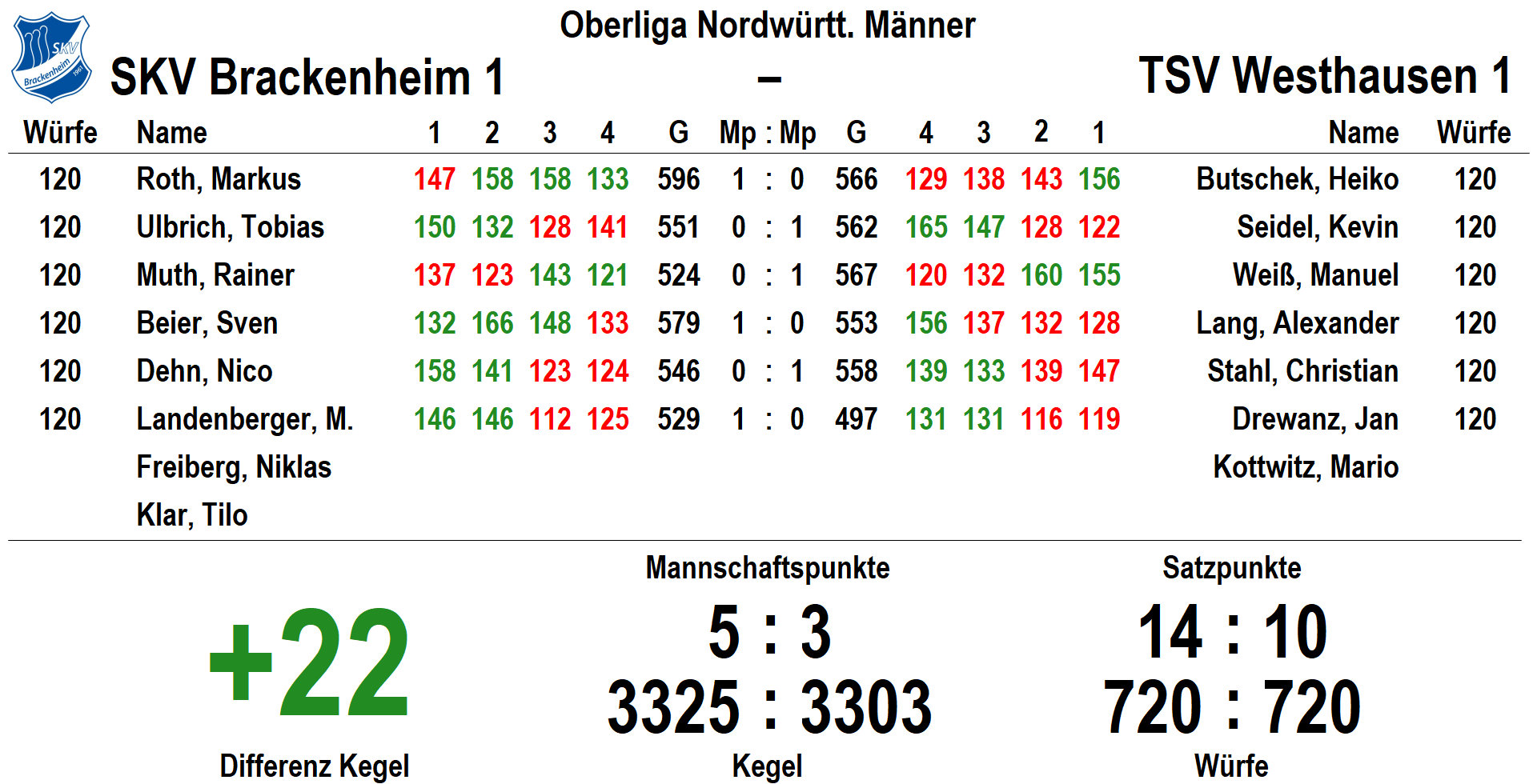 Einzelergebnisse: Markus Roth 596 (3:1), Sven Beier 579 (3:1), Tobias Ulbrich 551 (2:0), Nico Dehn 546 (2:0), Marcel Landenberger 529 (2:1), Rainer Muth 524 (2:0).