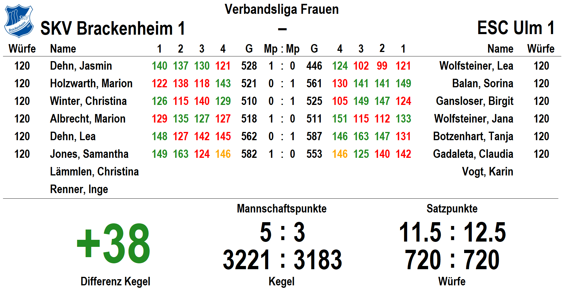 Die Frauen empfingen die Mannschaft aus der Münsterstadt Ulm. Anhand der Leistungen der vergangenen Woche, wurde ein spannendes Match erwartet. Zu Beginn tat sich heute Marion Holzwarth schwer. Mit 521 (1/0) konnte sie ihr Duell nicht gewinnen. Währenddessen hatte Jasmin Dehn mit 528 (3/1) heute die schwächste Gegnerin und konnte Punkt und einige Kegel gutmachen. Die Mittelachse übernahm mit 1:1 und 42 Kegel Vorsprung. Marion Albrecht 518 (2/1) und Christina Winter 510 (2/0) spielten mit den Gästen etwa gleichauf und übergaben ein 2:2 mit 34 Kegel Vorsprung. Das Schlusspaar kamen auf beiden Seiten nochmals sehr gute Ergebnisse. Beide Teams wollten die Punkte haben. Lea Dehn gewann zwar den Punkt nicht, erreichte jedoch trotz Zwischentief sehr gute 562 (1/0). Schlusspartnerin Samantha Jones gewann mit starken 582 (2,5/1) ihr Duell. Durch die bessere Gesamtkegelzahl konnte das Spiel für die SKV-Frauen entschieden werden und somit sackte man weitere zwei Zähler auf die Habenseite der Tabelle.