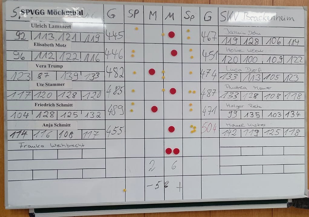 Möckmühl – 2 Bahnen-Anlage – und lange sieglos. Seit Jahren versucht man dort zu gewinnen. Vielleicht heute. Jasmin Dehn 467 (2,5/1) und Heike Klenk 451 (2/1) legten mit zwei gewonnenen Duellen einen guten Grundstein. Luca Djerfi 474 (2/0) musste sein Duell knapp abgeben. Noch knapper ergatterte Andrea Maurer 486 (2,5/1) den nächsten SKV-Punkt. Zwischenstand 3:1 und 20 Kegel Plus für Brackenheim. Holger Retz fand sich heute mit 471 (2/0) nicht zurecht und musste seinen Punkt und 18 Kegel abgeben. Michael Kustes erreichte mit 504 (4/1) eine super Leistung und konnte seinen Gegner deutlich schlagen. Der erste Sieg seit 13 Jahren war somit da!
