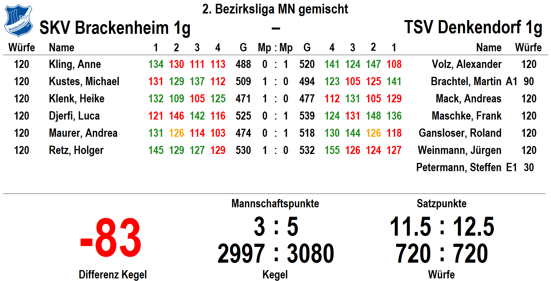 2. Bezirksliga MN gemischt: SKV – TSV Denkendorf 3:5 (2997:3080)