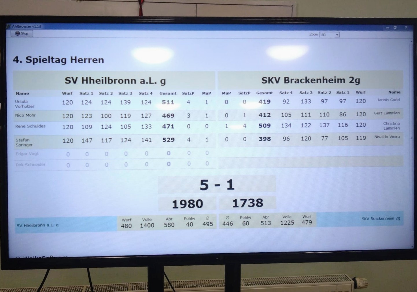 Zum Lokalderby fuhr die 4er Mannschaft. Den Anfang machten Jannis Gudd 419 (0/0) und Gert Lämmlen 412 (1/0). Beide mussten ihre Duelle abgeben und somit stand es 2:0 und bereits 149 Kegel für den Gastgeber. Nivaldo Vieira mit 398 (0/0) fand sich ebenfalls nicht zurecht und musste abgeben. Christina Lämmlen zeigte mit 509 (4/1) ein gutes Spiel und gewann ihr Duell, was jedoch am Endergebnis für dieses Spiel nichts mehr ändern sollte.