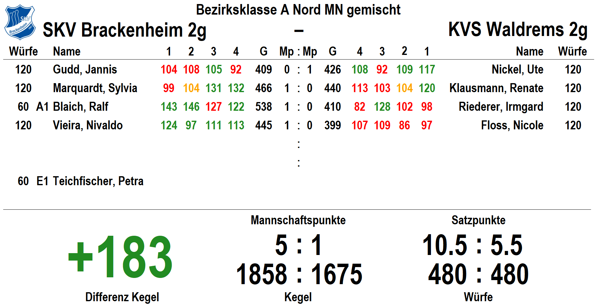 Bezirksklasse A Nord MN gemischt: SKV 2g – KVS Waldrems 2g 5:1 (1859:1675)
