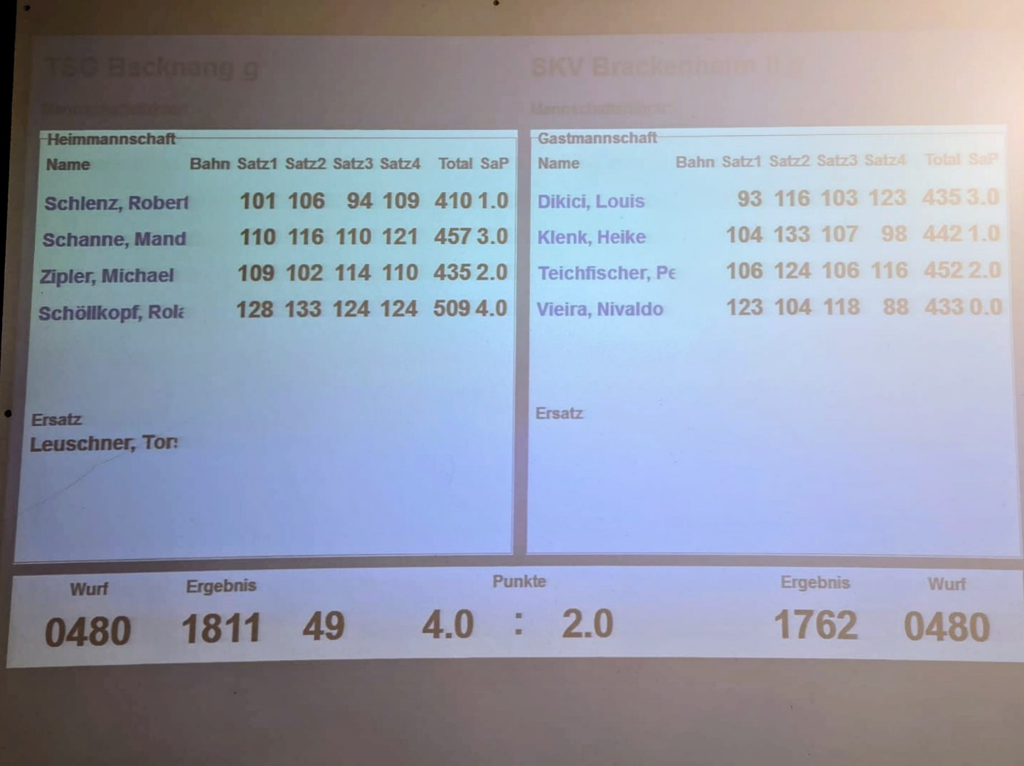 Bezirksklasse A Nord MN gemischt: TSG Backnang – SKV Brackenheim 2g 4:2 (1811:1762)
