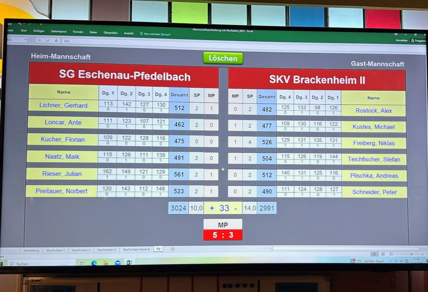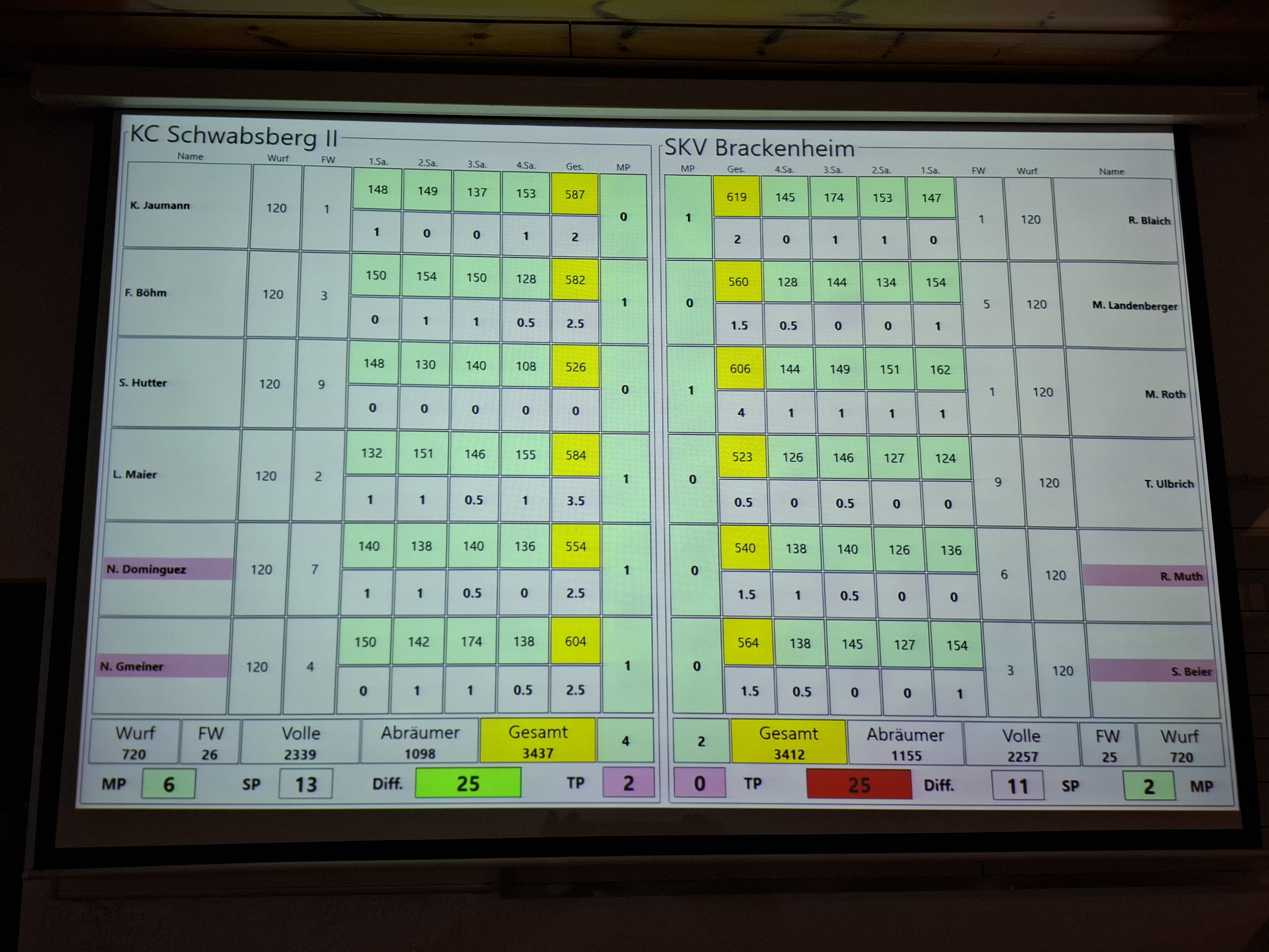 Einzelergebnisse: Markus Roth 596 (3:1), Sven Beier 579 (3:1), Tobias Ulbrich 551 (2:0), Nico Dehn 546 (2:0), Marcel Landenberger 529 (2:1), Rainer Muth 524 (2:0).