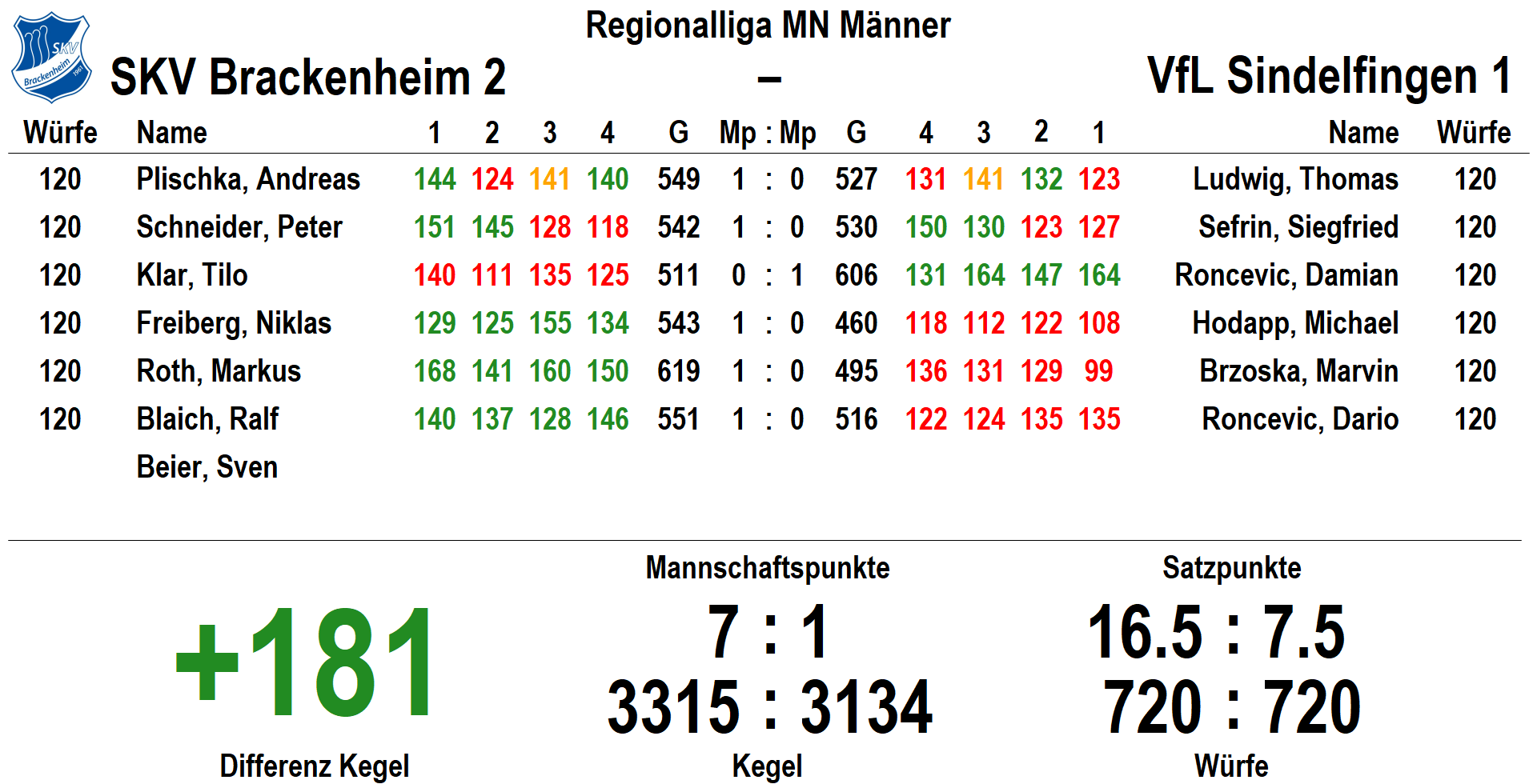 Niklas Freiberg 528 (3/1), Alex Rostock 513 (1/0), Andreas Plischka 508 (2/0), Peter Schneider 505 (1/0), Stefan Teichfischer 468 (1/0), Tilo Klar 455 (0/0)