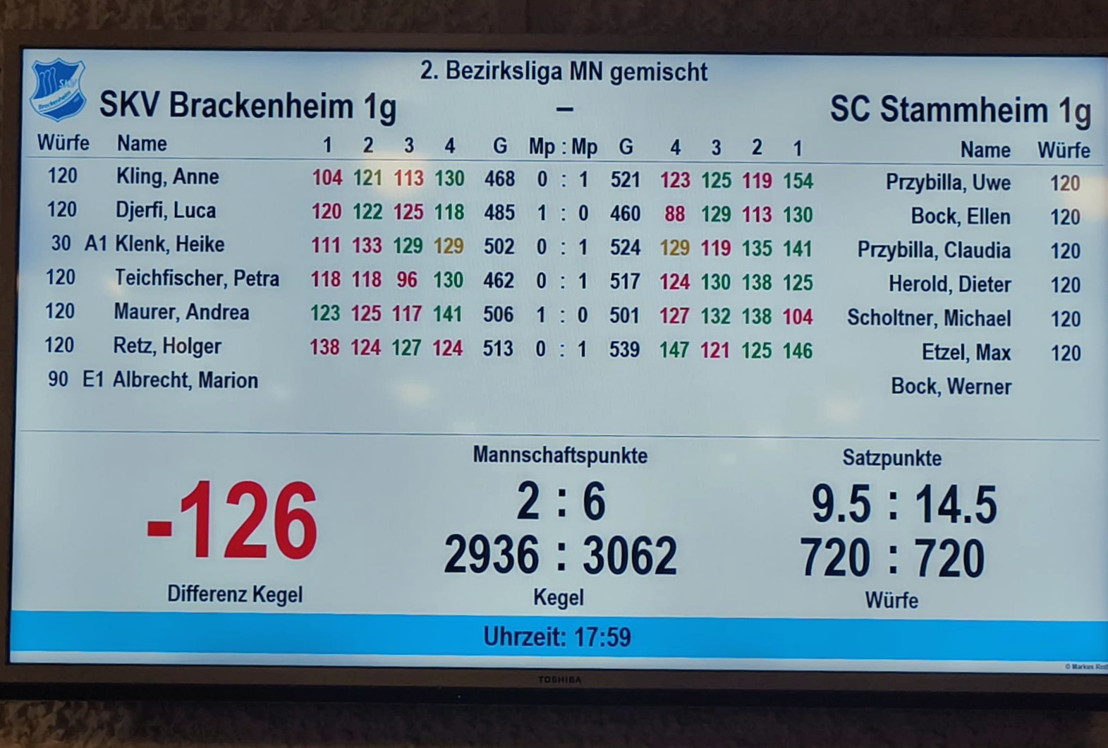 Einzelergebnisse: Holger Retz 524 (3:1), Michael Kustes 523 (3:1), Luca Djerfi 509 (3:1), Andrea Maurer 490 (2,5:1), Annemarie Kling 474 (1:0), Heike Klenk 423 (1:0).