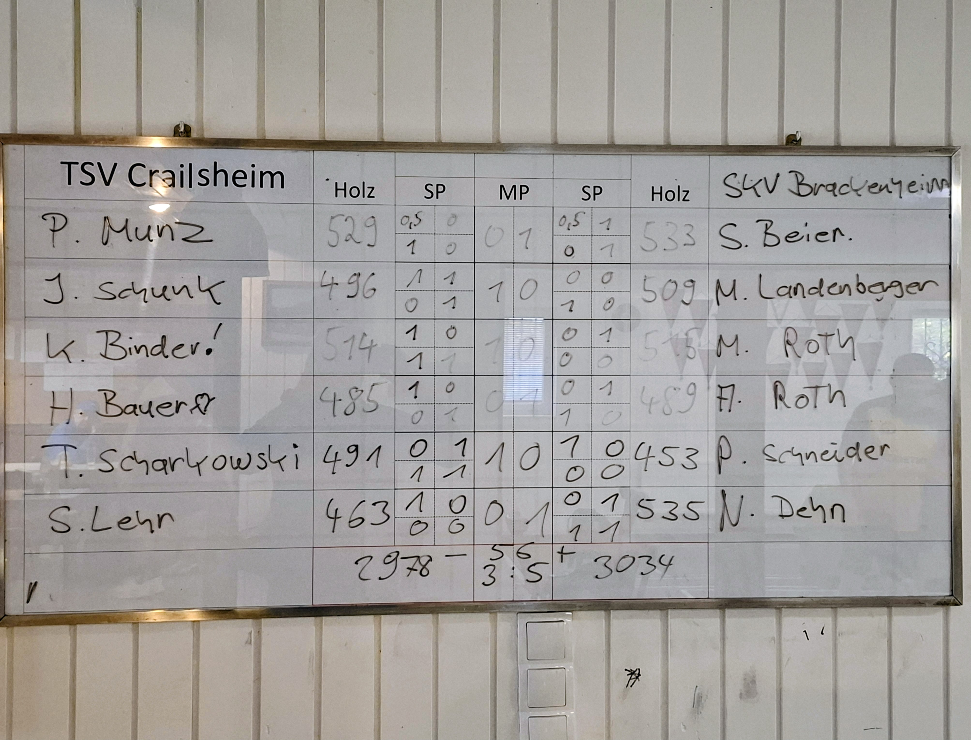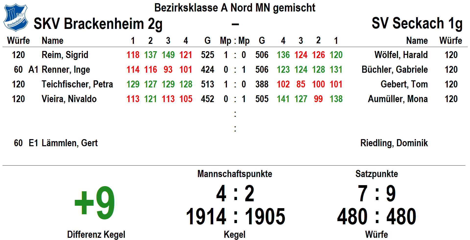 Möckmühl – 2 Bahnen-Anlage – und lange sieglos. Seit Jahren versucht man dort zu gewinnen. Vielleicht heute. Jasmin Dehn 467 (2,5/1) und Heike Klenk 451 (2/1) legten mit zwei gewonnenen Duellen einen guten Grundstein. Luca Djerfi 474 (2/0) musste sein Duell knapp abgeben. Noch knapper ergatterte Andrea Maurer 486 (2,5/1) den nächsten SKV-Punkt. Zwischenstand 3:1 und 20 Kegel Plus für Brackenheim. Holger Retz fand sich heute mit 471 (2/0) nicht zurecht und musste seinen Punkt und 18 Kegel abgeben. Michael Kustes erreichte mit 504 (4/1) eine super Leistung und konnte seinen Gegner deutlich schlagen. Der erste Sieg seit 13 Jahren war somit da!