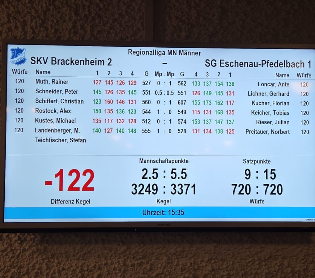 Regionalliga MN Männer SKV Brackenheim 2 SG Eschenau-Pfedelbach 1 2.5 : 5.5 9.0 : 15.0 3249 : 3371 -122